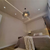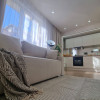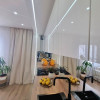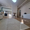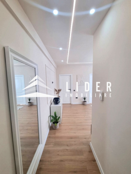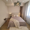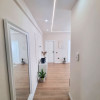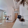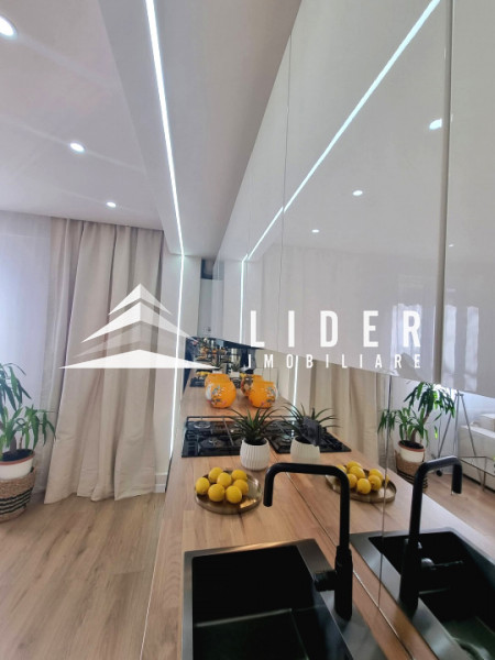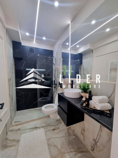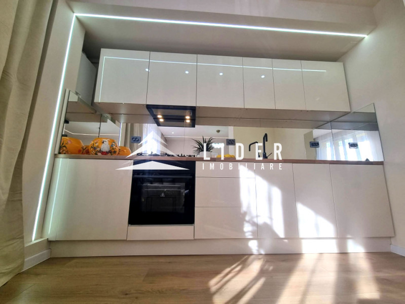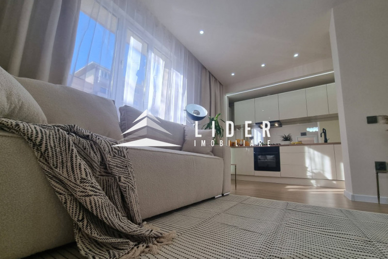 Interiorul apartamentului, cu o suprafață utilă de 44 mp, a fost refăcut integral, beneficiind de instalații electrice și sanitare noi, centrală termică proprie. Compartimentarea cuprinde un hol de acces, o bucătărie minimalistă realizată din MDF ultralucios în nuanța deosebită Sabbia d’Oro cu sisteme push, o zonă de zi primitoare dotată cu o canapea Teddy cu funcție de dormit și un dormitor spectaculos decorat cu riflaje elegante și corpuri de iluminat unicate de designer. Baia este finisată cu plăci de gresie și faianță mată cu format deosebit, fiind utilată cu vas WC suspendat Roca, rigolă de duș și panou de sticlă securizată.