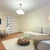 Bucătăria este dotată cu electrocasnice moderne: mașină de spălat vase, mașină de spălat rufe, cuptor electric, plită pe gaz și frigider. Mobilierul este realizat pe comandă, cu un design unitar și elegant. Finisajele includ parchet Egger cu garanție 10 ani, gresie și faianță Tubadzin din gama premium, baterii Grohe, corpuri de iluminat LED, prize și întrerupătoare cu rame din sticlă.