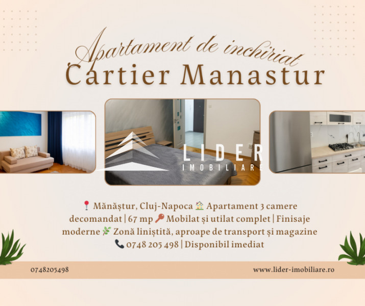 Lider Imobiliare vă propune spre închiriere un apartament cu 3 camere decomandat, situat în cartierul Mănăștur, într-o zonă liniștită și accesibilă. Cu o suprafață utilă de 67 mp, apartamentul este compartimentat în: hol de intrare, bucătărie cu spațiu de depozitare (cămara), 3 camere, baie cu geam și un balcon generos închis.