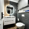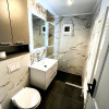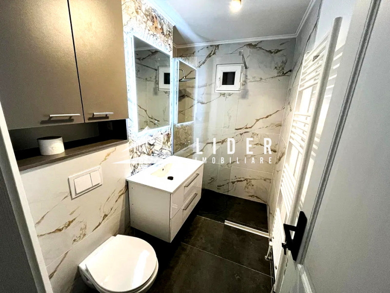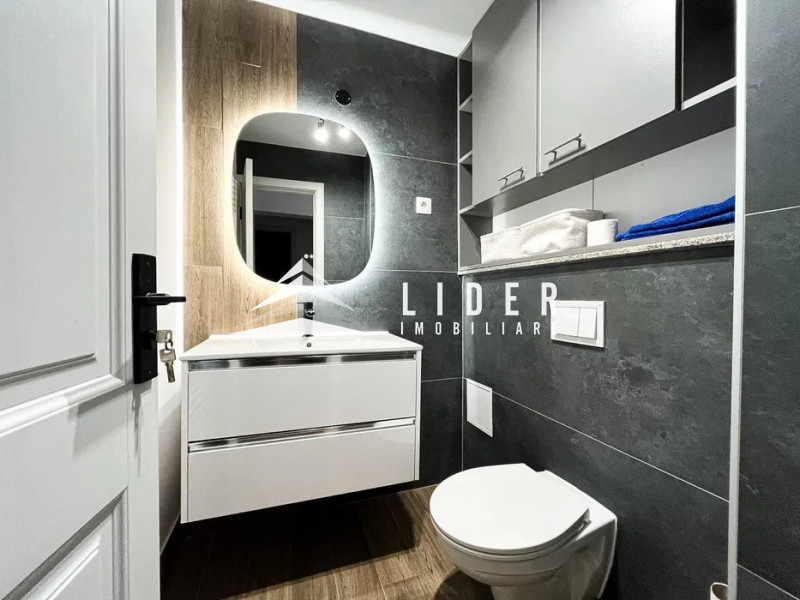 Apartamentul are o suprafață de 64 mp și este compartimentat eficient în două dormitoare, living, bucătărie complet echipată și două băi. Bucătăria este dotată cu mașină de spălat vase și mașină de spălat rufe, plită pe gaz, cuptor și hotă, oferind funcționalitate și confort pentru utilizare imediată. Cele două băi adaugă un plus important de confort, una dintre ele fiind prevăzută cu duș și geam, iar oglinzile LED cu funcție de dezaburire completează amenajarea modernă. Apartamentul include două holuri cu cuier și spații de depozitare, aspect care optimizează foarte bine utilizarea spațiului.